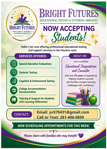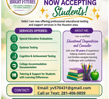 ”It is my pleasure to enthusiastically recommend Bright Futures for Educational Diagnostic services. I have specifically chosen Bright Futures to test two of my children for testing services. I drove from Shreveport, LA, to Houston, TX, because I had been told by my family that they were the best. I was not misinformed! Both of my children reported feeling at ease during their testing time with them. I am very thankful that I chose to test at their center. During the time together, Bright Futures proved to be very knowledgeable about their field of study. Their expertise in testing was a huge asset that has helped to lead to my oldest son’s success in college! (He just made the President’s List again with 18 hours!). I am confident without reservation that choosing Bright Future’s testing center would be an excellent choice for any parent! As Bright Futures has years of experience and the skills that you are looking for in order to have the positive results that you are looking for as a parent!.”